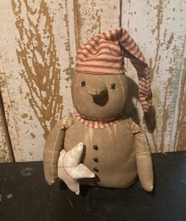 This snowman is about 12" made from osnaburg with a red ticking cap, black beans and his holding a white star.