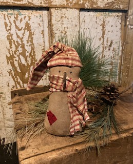 This wee willie is wearing a red ticking cap and scarf approx. 7" stands