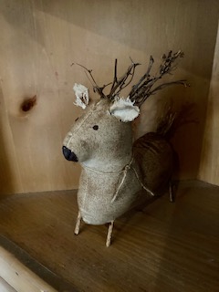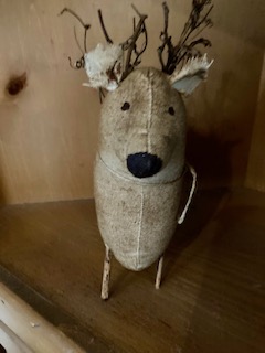 This reindeer is made from aged osnaburg with stick legs and twig antlers. 7"x6"