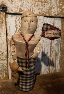 This is my sweet liberty doll, her body is made from blue check homespun and muslin. She is holding a handmade muslin star and flag. Hand stitched face 18" weighed to stand.