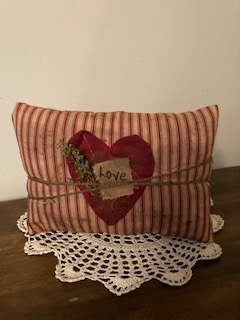 This is my red ticking pillow with a red heart tied in the center with jute and a sprig of sweet Annie.