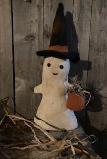 This sweet lil ghost is painted white then slightly grunge. It is holding a orange pumpkin bag. stands 13"