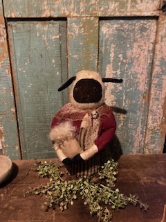 This sheep doll is made from antique felt then aged, She is wearing a cranberry coat and black ticking apron. Nestled in her arm a bag of wool 13" stands