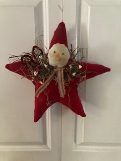 This star is red flannel and aged. Attached pocket filled with a snowman head, red berry, white berry, twigs and grungy candy canes. Approx. 12x12