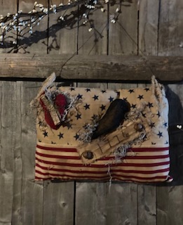 This Hanging flag pillow is approx. 13x10". "1776" grungy banner with a crow and prim red heart.