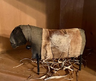 This prim black sheep is 9x4" with sack of wool in a pocket.