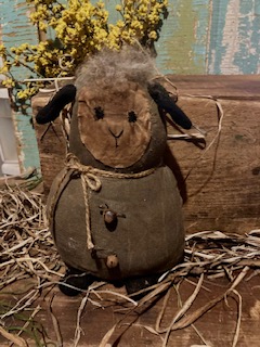 This grayish grungy sheep has a stitched face, with a jute tie pins and bells . Weighed to stand 11"